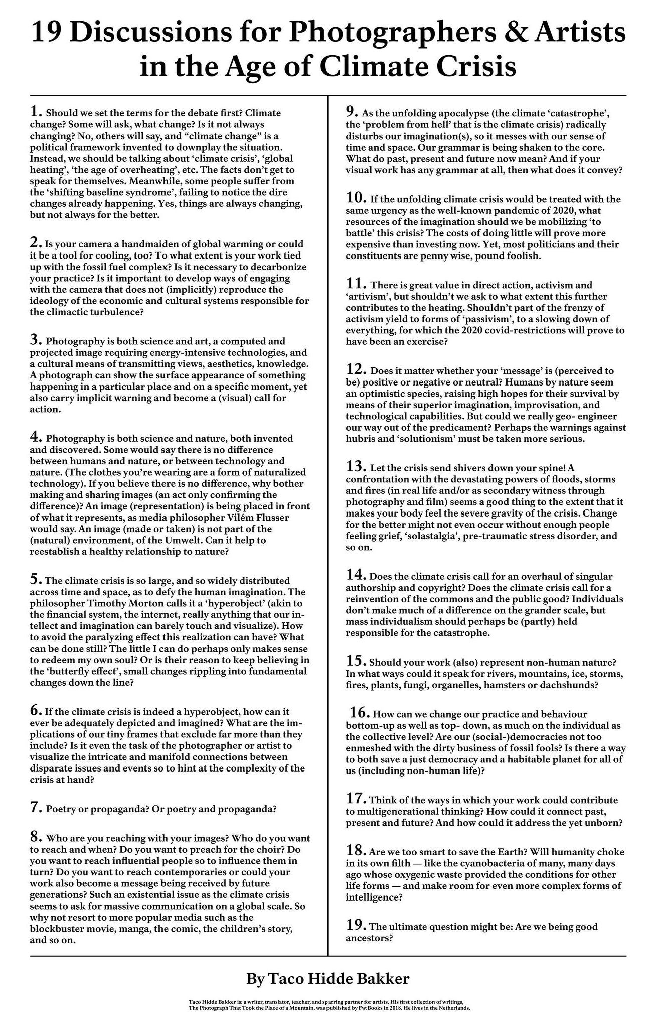 In 2020 I wrote an experimental text on photography, art and the climate crisis for the Photobook Festival Oslo. Here you can read 19 Discussions for Photographers and Artists in the Age of Climate Crisis. Another tentative piece of writing related to images and the climate I wrote can be read at TRIGGER, the online platform of Photomuseum Antwerp, here.